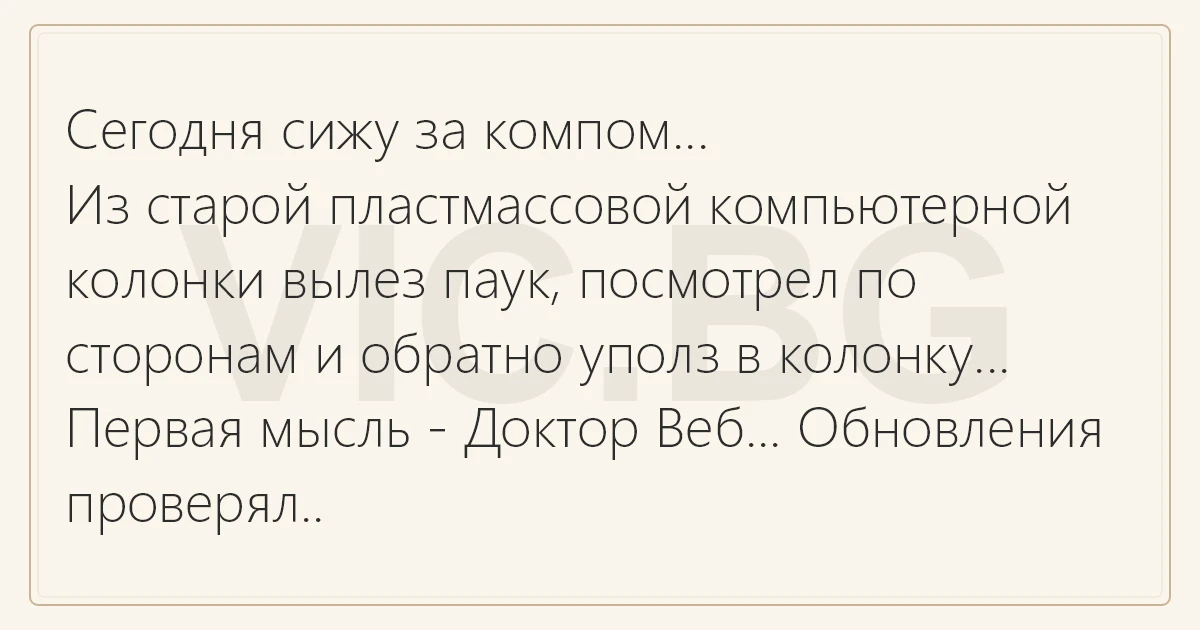 Сегодня сижу за компом... Из старой пластмассовой компьютерной колонки вылез паук, посмотрел по сторонам и обратно уполз в колонку... Первая мысль - Доктор Веб... Обновления проверял..