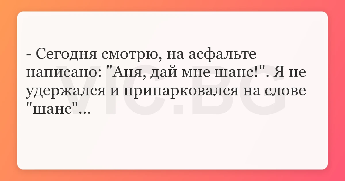 - Сегодня смотрю, на асфальте написано: "Аня, дай мне шанс!". Я не удержался и припарковался на слове "шанс"...