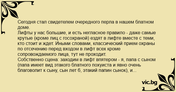 Собственно сцена: заходим в лифт впятером - я, папа с сыном (папа имеет вид этакого блатного похуиста и явно очень благоволит к сыну, сын лет 6, этакий папин сынок), и мужик с охранником. Мужик похож на солидного дядю из 90-х, но не бандита а именно бизнесмена. Охранник крепкий и в солнцезащитных очках на пол лица, хотя на улице дождь. Двери закрываются, ехать всем высоко. Мальчик постоянно тараторит полную билиберду, и вдруг поворачивается к мужику бизнесмену и радостно так с улыбкой говорит: "Пошел нах.й пид.с!". Типа завершения стишка у него получилось. Батя его несколько виновато смотрит на мужика-бизнесмена, говоря своим взглядом что типа мальчик ещё маленький и все такое. Мужик-бизнесмен строго смотрит на мальчика, потом поднимает свои глаза и смотрит на охранника. И тут охранник снимает очки. И смотрит на папу мальчика. Молча.