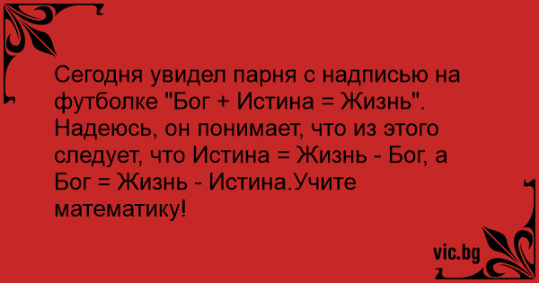 Сегодня увидел парня с надписью на футболке "Бог + Истина = Жизнь".