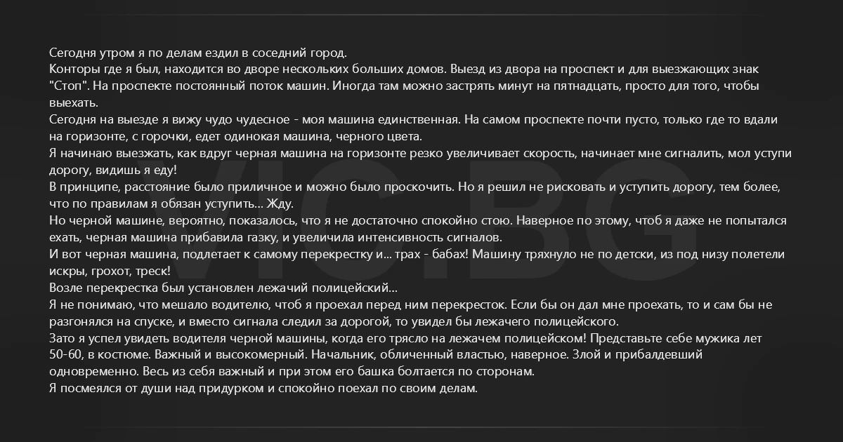 Сегодня утром я по делам ездил в соседний город. Конторы где я был, находится во дворе нескольких больших домов. Выезд из двора на проспект и для выезжающих знак "Стоп". На проспекте постоянный поток машин. Иногда там можно застрять минут на пятнадцать, просто для того, чтобы выехать. Сегодня на выезде я вижу чудо чудесное - моя машина единственная. На самом проспекте почти пусто, только где то вдали на горизонте, с горочки, едет одинокая машина, черного цвета. Я начинаю выезжать, как вдруг черная машина на горизонте резко увеличивает скорость, начинает мне сигналить, мол уступи дорогу, видишь я еду! В принципе, расстояние было приличное и можно было проскочить. Но я решил не рисковать и уступить дорогу, тем более, что по правилам я обязан уступить… Жду. Но черной машине, вероятно, показалось, что я не достаточно спокойно стою. Наверное по этому, чтоб я даже не попытался ехать, черная машина прибавила газку, и увеличила интенсивность сигналов. И вот черная машина, подлетает к самому перекрестку и... трах - бабах! Машину тряхнуло не по детски, из под низу полетели искры, грохот, треск! Возле перекрестка был установлен лежачий полицейский… Я не понимаю, что мешало водителю, чтоб я проехал перед ним перекресток. Если бы он дал мне проехать, то и сам бы не разгонялся на спуске, и вместо сигнала следил за дорогой, то увидел бы лежачего полицейского. Зато я успел увидеть водителя черной машины, когда его трясло на лежачем полицейском! Представьте себе мужика лет 50-60, в костюме. Важный и высокомерный. Начальник, обличенный властью, наверное. Злой и прибалдевший одновременно. Весь из себя важный и при этом его башка болтается по сторонам. Я посмеялся от души над придурком и спокойно поехал по своим делам.