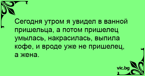Сегодня утром я увидел в ванной пришельца, а потом пришелец умылась, накрасилась, выпила кофе, и вроде уже не пришелец, а жена.