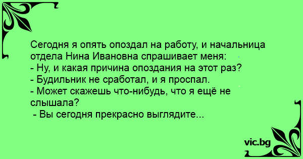 Сегодня я опять опоздал на работу, и начальница отдела Нина Ивановна спрашивает меня: