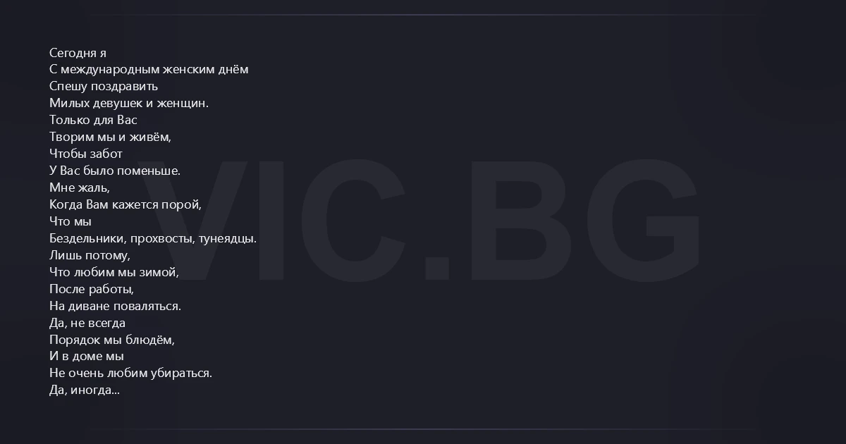 Сегодня я С международным женским днём Спешу поздравить Милых девушек и женщин. Только для Вас Творим мы и живём, Чтобы забот У Вас было поменьше. Мне жаль, Когда Вам кажется порой, Что мы Бездельники, прохвосты, тунеядцы. Лишь потому, Что любим мы зимой, После работы, На диване поваляться. Да, не всегда Порядок мы блюдём, И в доме мы Не очень любим убираться. Да, иногда Коньяк и водку пьём. И любим мы Друг с дружкою подраться. И пусть еду Готовим редко мы, Зато известно, Что умеем мы готовить. Да и посуду Чаще мыть должны, А так же пол Мыть наравне с женою. Я Вас прошу В дискуссию сейчас Давайте-ка Не будем мы вдаваться. В такие темы Как, машина, сад, гараж, Ещё работа Мы не будем углубляться. Но если мы, На миг предположу, Изменимся, Став ненадолго Вами, Ну, вот тогда На Вас я погляжу… Уверен, жить Не сможете Вы с нами. И потому Останемся, друзья, Мы в прежнем, Образе, в своих душе и теле. А впрочем, Заболтался, что-то я, И мои бредни Вам наверно надоели. Хочу сказать Я в заключенье Вам, Что мы Вас Очень сильно обожаем. Как не крути, Нам не прожить без дам. Мы в этот день Любви и счастья Вам желаем.