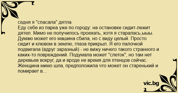 Еду себе из парка уже по городу: на остановке сидит-лежит дятел. Мимо не получилось проехать, хотя я старалась,ыыы. Думаю может его машина сбила, но с виду целый. Просто сидит и клювом в землю, глаза прикрыл. Я его палочкой подвигала (вдруг заразный) - не вижу ничего такого странного и каких-то повреждений. Подумала может "слеток", но там нет деревьев вокруг, да и вроде не время для птенцов сейчас. Женщина мимо шла, предположила что может он старенький и помирает в силу возраста. Пить он не стал. Думаю блин, бросить уже жалко. У меня ветеринар специализируется и на птицах, ну может отвезу ему завтра (если не сдохнет). Взяла его салфеткой (он даже не рыпнулся) и посадила в контейнер из под еды, который у меня был с собой. Иду, одной рукой велосипед веду, второй этот контейнер несу с дятлом, крышку тока прикрыла. Пару раз неудачно с бордюра спустилась, тряхнула контейнер, дятел башкой приложился об крышку. И начал вдруг активно пытаться выбраться, причем так активно что коробка у меня выпала из рук, а он резво вылетел и на дерево. А там еще один дятел (я даже не знала что у нас стока дятлов в городе). Не успела я обрадоваться, что этот живой и даже сразу друзей обрел, как они стали драться. О как! за территорию видно. После этого он улетел куда-то в даль. Вот что это было? может у него адреналин выбросился и он очнулся? отнесла я его не очень далеко, может полминуты птичьего лета. Надеюсь я не навредила ему своей инициативой.