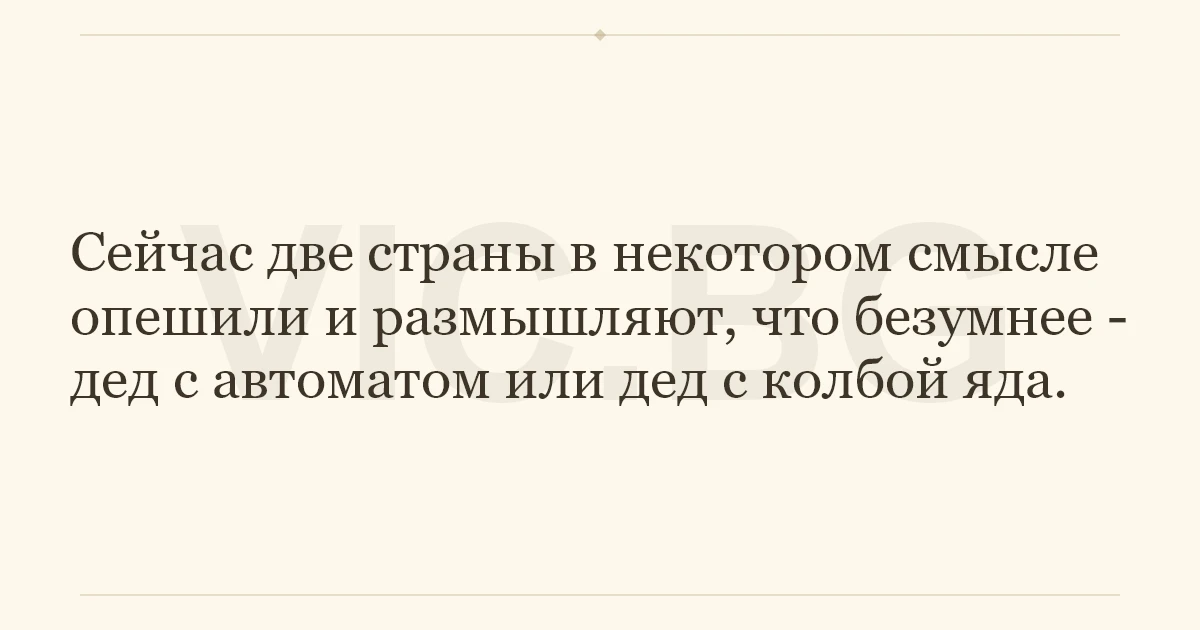 Сейчас две страны в некотором смысле опешили и размышляют, что безумнее - дед с автоматом или дед с колбой яда.