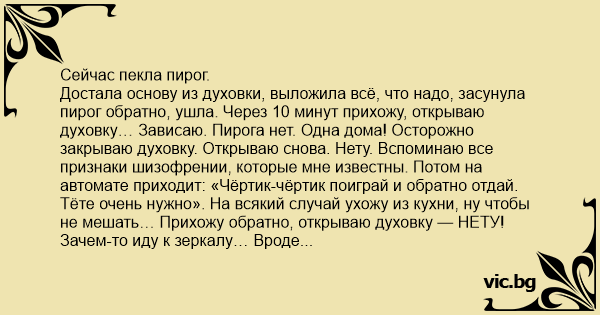 Достала основу из духовки, выложила всё, что надо, засунула пирог обратно, ушла. Через 10 минут прихожу, открываю духовку… Зависаю. Пирога нет. Одна дома! Осторожно закрываю духовку. Открываю снова. Нету. Вспоминаю все признаки шизофрении, которые мне известны. Потом на автомате приходит: «Чёртик-чёртик поиграй и обратно отдай. Тёте очень нужно». На всякий случай ухожу из кухни, ну чтобы не мешать… Прихожу обратно, открываю духовку — НЕТУ! Зачем-то иду к зеркалу… Вроде внешних изменений никаких. Набираю — веяние времени — в гугле «из духовки пропал пирог». Понимаю, что делаю что-то не то. Щипнула себя за руку — реакция есть. Сказала себе: «Света! Ты взрослая, умная женщина! Ну куда он мог деться?» Подумалось про соседей, привлечённых запахом свежей выпечки. Балкон открыт. Вышла, посмотрела. Ни фигa не залезть. Иду обратно на кухню, в полном расстройстве психики. Почему-то вспоминаются «Секретные материалы»… Представляю инопланетян, жадно жующих мой пирог в своей тарелке и начинаю ржать… Выпиваю стакан воды. Открываю посудомойку, чтобы поставить пустой стакан. Оттуда изумлённо таращится мой пирог… Дверцы-то рядом… А мне в отпуск пора, ага…