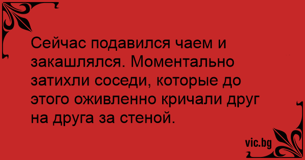 Сейчас подавился чаем и закашлялся. Моментально затихли соседи, которые до этого оживленно кричали друг на друга за стеной.