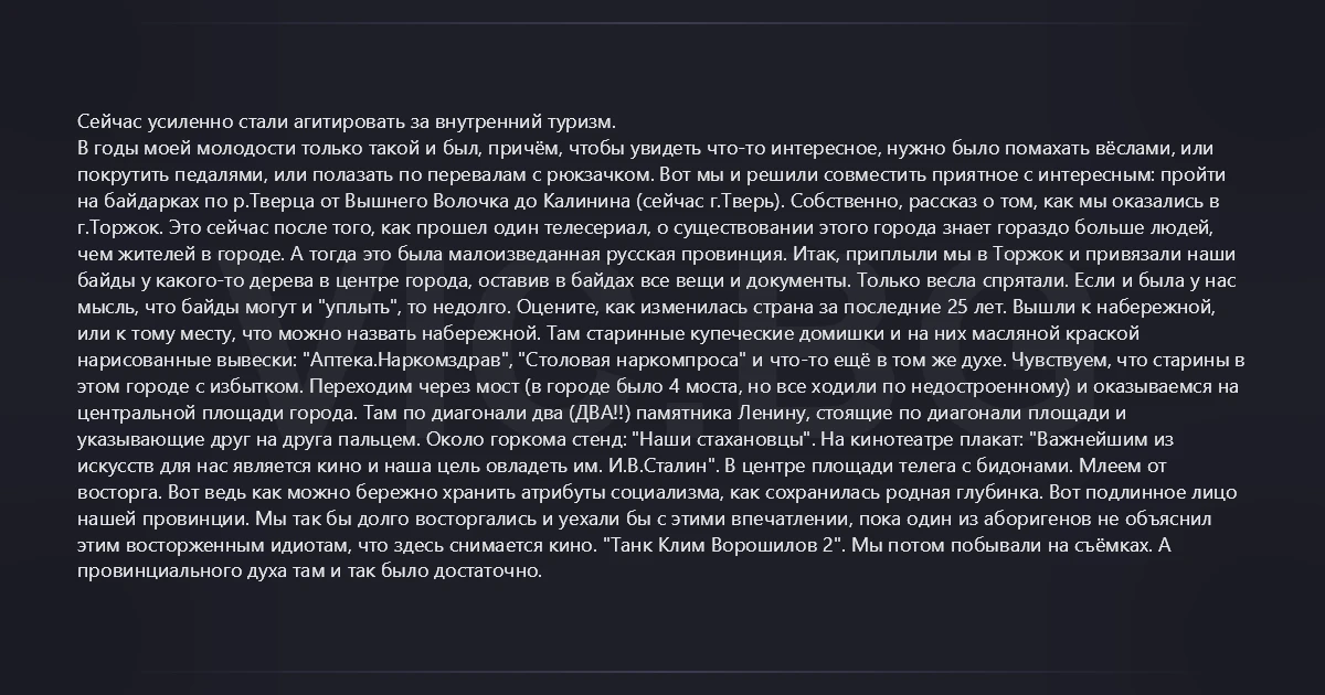 В годы моей молодости только такой и был, причём, чтобы увидеть что-то интересное, нужно было помахать вёслами, или покрутить педалями, или полазать по перевалам с рюкзачком. Вот мы и решили совместить приятное с интересным: пройти на байдарках по р.Тверца от Вышнего Волочка до Калинина (сейчас г.Тверь). Собственно, рассказ о том, как мы оказались в г.Торжок. Это сейчас после того, как прошел один телесериал, о существовании этого города знает гораздо больше людей, чем жителей в городе. А тогда это была малоизведанная русская провинция. Итак, приплыли мы в Торжок и привязали наши байды у какого-то дерева в центре города, оставив в байдах все вещи и документы. Только весла спрятали. Если и была у нас мысль, что байды могут и "уплыть", то недолго. Оцените, как изменилась страна за последние 25 лет. Вышли к набережной, или к тому месту, что можно назвать набережной. Там старинные купеческие домишки и на них масляной краской нарисованные вывески: "Аптека.Наркомздрав", "Столовая наркомпроса" и что-то ещё в том же духе. Чувствуем, что старины в этом городе с избытком. Переходим через мост (в городе было 4 моста, но все ходили по недостроенному) и оказываемся на центральной площади города. Там по диагонали два (ДВА!!) памятника Ленину, стоящие по диагонали площади и указывающие друг на друга пальцем. Около горкома стенд: "Наши стахановцы". На кинотеатре плакат: "Важнейшим из искусств для нас является кино и наша цель овладеть им. И.В.Сталин". В центре площади телега с бидонами. Млеем от восторга. Вот ведь как можно бережно хранить атрибуты социализма, как сохранилась родная глубинка. Вот подлинное лицо нашей провинции. Мы так бы долго восторгались и уехали бы с этими впечатлении, пока один из аборигенов не объяснил этим восторженным идиотам, что здесь снимается кино. "Танк Клим Ворошилов 2". Мы потом побывали на съёмках. А провинциального духа там и так было достаточно.