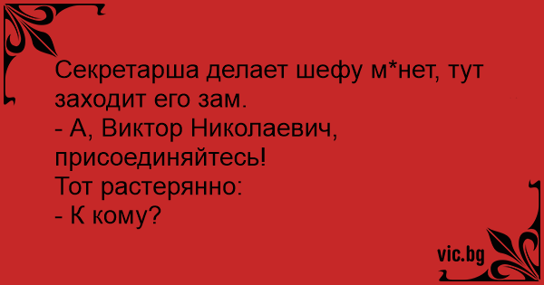 Секретарка робить шефу мінет, тут заходить його заступник. - А, Віктор Миколайович, приєднуйтесь! Той розгублено: - До кого?