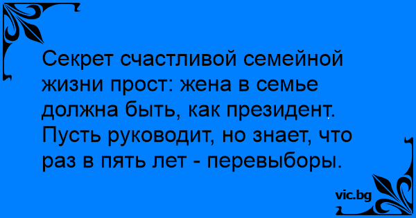 Секрет счастливой семейной жизни прост: жена в семье должна быть, как президент. Пусть руководит, но знает, что раз в пять лет - перевыборы.