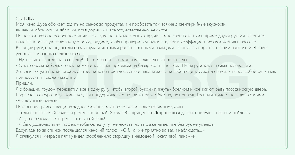 Но на этот раз она особенно отличилась – уже на выходе с рынка, вручила мне свои пакетики и прямо двумя руками деловито полезла в большую селедочную бочку, видимо, чтобы проверить упругость тушек и коэффициент их скольжения в рассоле.