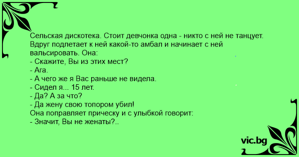 Сельская дискотека. Стоит девчонка одна - никто с ней не танцует. Вдруг подлетает к ней какой-то амбал и начинает с ней вальсировать. Она: