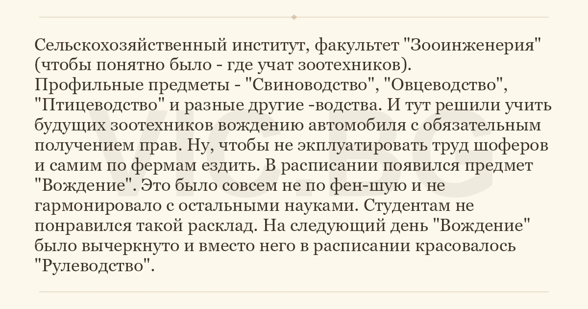 Профильные предметы - "Свиноводство", "Овцеводство", "Птицеводство" и разные другие -водства. И тут решили учить будущих зоотехников вождению автомобиля с обязательным получением прав. Ну, чтобы не экплуатировать труд шоферов и самим по фермам ездить. В расписании появился предмет "Вождение". Это было совсем не по фен-шую и не гармонировало с остальными науками. Студентам не понравился такой расклад. На следующий день "Вождение" было вычеркнуто и вместо него в расписании красовалось "Рулеводство".