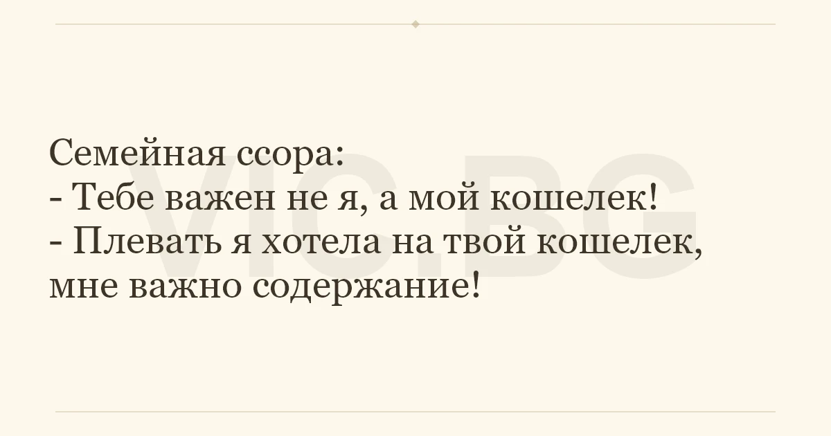 Семейная ссора: - Тебе важен не я, а мой кошелек! - Плевать я хотела на твой кошелек, мне важно содержание!