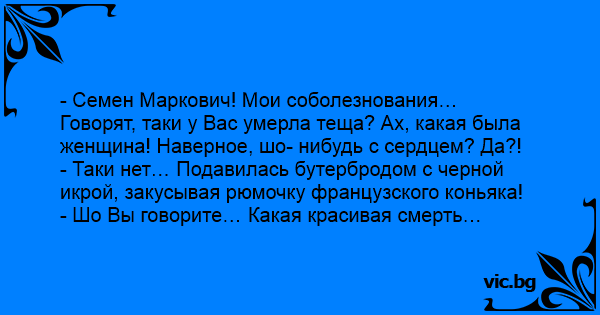 - Семен Маркович! Мои соболезнования… Говорят, таки у Вас умерла теща? Ах, какая была женщина! Наверное, шо- нибудь с сердцем? Да?!