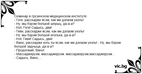 - Вано, расскаджи хоть ты всэм, как ми дэлаэм уколь! - Ну, мы бэрэм болшой задныца, да-а-а?