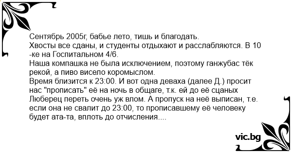 Время близится к 23:00. И вот одна деваха (далее Д.) просит нас "прописать" её на ночь в общаге, т.к. ей до её сцаных Люберец переть очень уж влом. А пропуск на неё выписан, т.е. если она не свалит до 23:00, то прописавшему её человеку будет ата-та, вплоть до отчисления. Знакомых с окончанием фамилии на "-ко" не нашлось, и надо разработать СуперПлан!