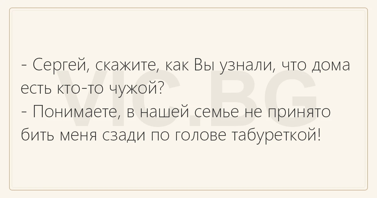- Сергей, скажите, как Вы узнали, что дома есть кто-то чужой? - Понимаете, в нашей семье не принято бить меня сзади по голове табуреткой!