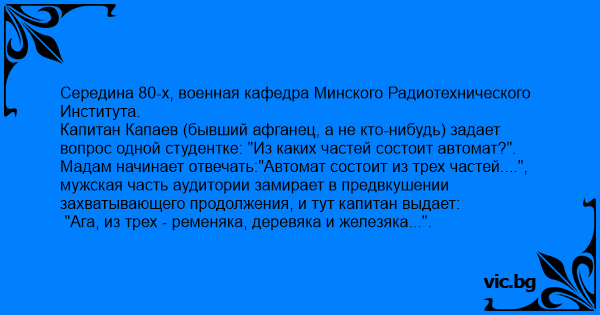 Капитан Капаев (бывший афганец, а не кто-нибудь) задает вопрос одной студентке: "Из каких частей состоит автомат?".