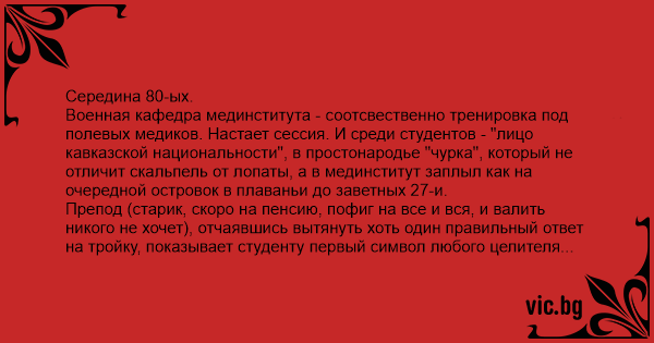 Препод (старик, скоро на пенсию, пофиг на все и вся, и валить никого не хочет), отчаявшись вытянуть хоть один правильный ответ на тройку, показывает студенту первый символ любого целителя - значок с кубком, змеями и крыльями, символ врачевателей вообщем. И говорит, обьяснишь чей этот символ - дам 3.