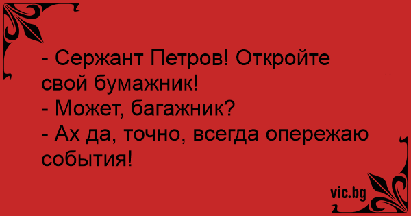 - Сержант Петров! Откройте свой бумажник!<br />- Может, багажник?<br />- Ах да, точно, всегда опережаю события!