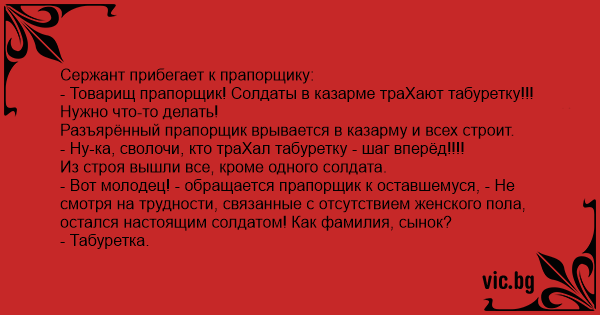 - Товарищ прапорщик! Солдаты в казарме тpaXают табуретку!!! Нужно что-то делать!