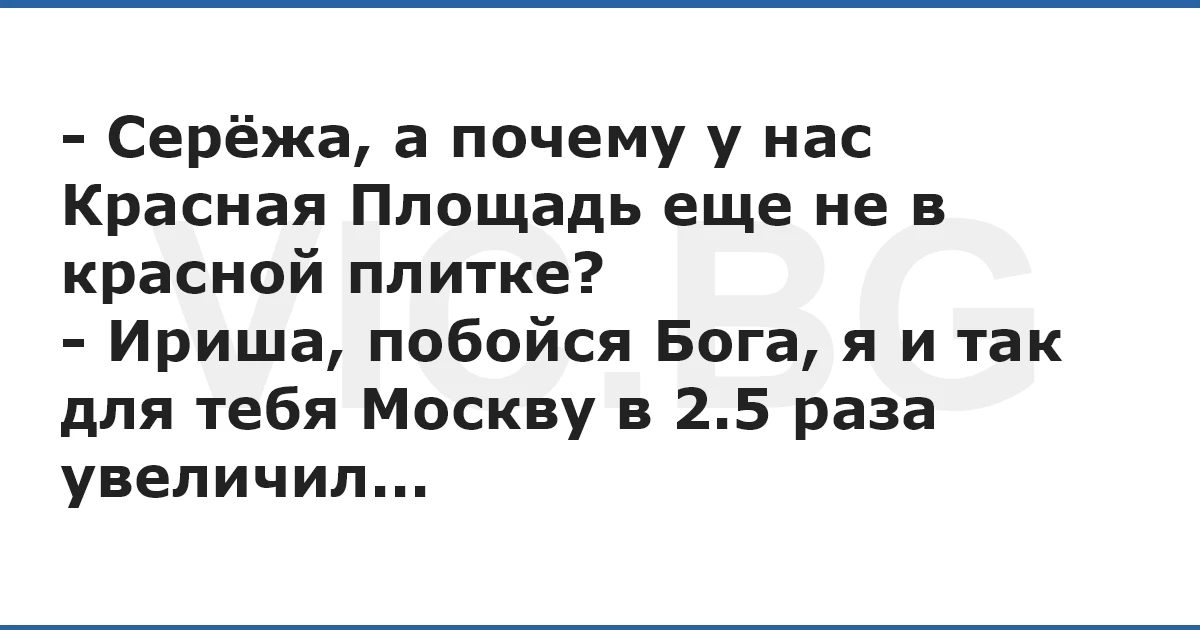 - Серёжа, а почему у нас Красная Площадь еще не в красной плитке? - Ириша, побойся Бога, я и так для тебя Москву в 2.5 раза увеличил...