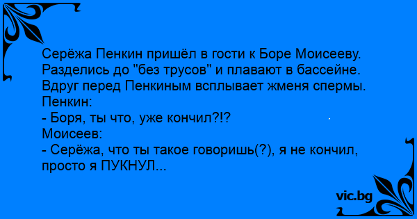 Разделись до "без трусов" и плавают в бассейне. Вдруг перед Пенкиным всплывает жменя спермы. Пенкин:
