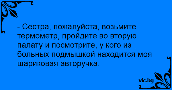 - Сестра, пожалуйста, возьмите термометр, пройдите во вторую палату и посмотрите, у кого из больных подмышкой находится моя шариковая авторучка.