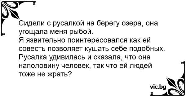 Я язвительно поинтересовался как ей совесть позволяет кушать себе подобных. Русалка удивилась и сказала, что она наполовину человек, так что ей людей тоже не жрать?