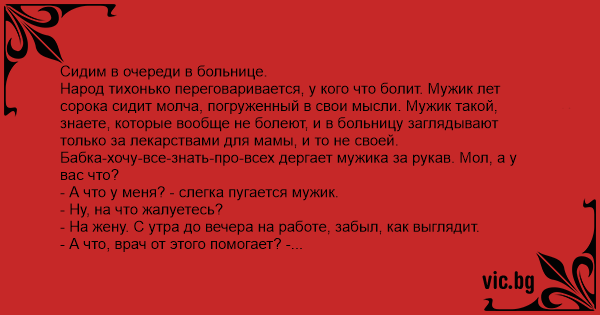 Народ тихонько переговаривается, у кого что болит. Мужик лет сорока сидит молча, погруженный в свои мысли. Мужик такой, знаете, которые вообще не болеют, и в больницу заглядывают только за лекарствами для мамы, и то не своей.