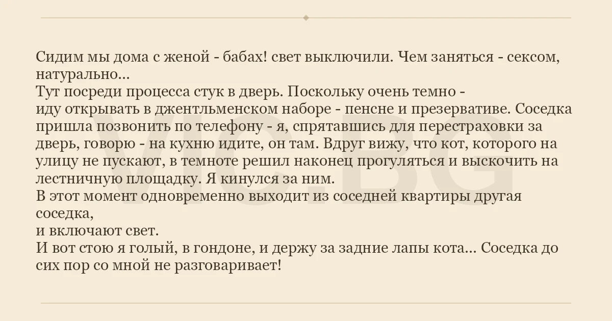И вот стою я голый, в гондоне, и держу за задние лапы кота... Соседка до