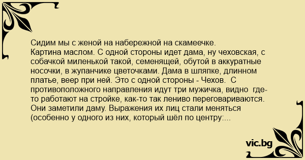 Картина маслом. С одной стороны идет дама, ну чеховская, с собачкой миленькой такой, семенящей, обутой в аккуратные носочки, в жупанчике цветочками. Дама в шляпке, длинном платье, веер при ней. Это с одной стороны - Чехов. С противоположного направления идут три мужичка, видно где-то работают на стройке, как-то так лениво переговариваются. Они заметили даму. Выражения их лиц стали меняться (особенно у одного из них, который шёл по центру: какое-то удивление, восторг, глаза широко открываются, что-то шевелит безмолвно губами. Разминулись они практически перед нами, посторонившись немного и пропустив даму с собаком. По прошествии нескольких метров этот, который по центру, разворачивается, смотрит вслед даме и с этим же выражением лица воздевает руки к небу и, закрыв глаза, тихо и внятно говорит: "Охуееееть!" Поверьте, в этом возгласе поместилось всё. Мы были в восторге.
