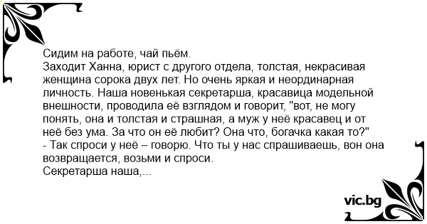 Заходит Ханна, юрист с другого отдела, толстая, некрасивая женщина сорока двух лет. Но очень яркая и неординарная личность. Наша новенькая секретарша, красавица модельной внешности, проводила её взглядом и говорит, "вот, не могу понять, она и толстая и страшная, а муж у неё красавец и от неё без ума. За что он её любит? Она что, богачка какая то?"