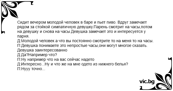 Сидит вечером молодой человек в баре и пьет пиво. Вдруг замечает рядом за стойкой симпатичную девушку.Парень смотрит на часы,потом на девушку и снова на часы.Девушка замечает это и интересуется у парня.