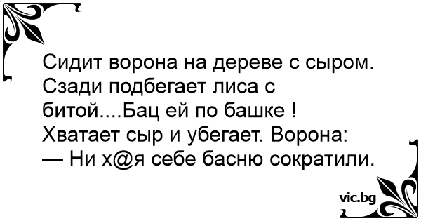 Сидит ворона на дереве с сыром. Сзади подбегает лиса с битой....Бац ей по башке ! Хватает сыр и убегает. Ворона: — Ни х@я себе басню сократили.