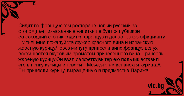 - Мсье! Мне пожалуйста фужер красного вина и испанскую жареную курицу.Через минуту принесли вино,француз вслух восхищается вкусовым ароматом принесенного вина.Принесли жареную курицу.Он взял салфетку,вытер ею пальчик,вставил его в попку курицы и говорит: Мсье,это не испанская курица.А Вы принесли курицу, выращенную в предместье Парижа, в 30 км от города и кормили её пшеном.Испуганный официант принес заказ на кухню и доложил о ситуации шеф повару.Тот послал помощника в супермаркет за испанской курицей.Последняя быстро была доставлена на кухню и приготовлена.Опять подали курицу французу.Тот повторил манипуляцию с пальчиком и попкой принесеной курицы и говорит: Мсье ,я заказывал испанскую жареную курицу,а Вы принесли мне курицу ,выращенную в 12 км. от Лиона и кормили её пшеницей.Обезумевший официант стоит с курицей в руках и не знает что ему делать. Внезапно из-за стола встает новый русский, подходит к столику, вытаскивает из кармана пресс налички говорит: