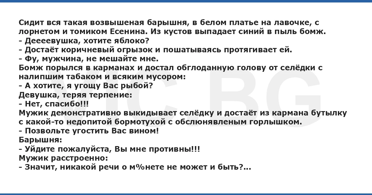Сидит вся такая возвышеная барышня, в белом платье на лавочке, с лорнетом и томиком Есенина. Из кустов выпадает синий в пыль бомж. - Деееевушка, хотите яблоко? - Достаёт коричневый огрызок и пошатываясь протягивает ей. - Фу, мужчина, не мешайте мне. Бомж порылся в карманах и достал обглоданную голову от селёдки с налипшим табаком и всяким мусором: - А хотите, я угощу Вас рыбой? Девушка, теряя терпение: - Нет, спасибо!!! Мужик демонстративно выкидывает селёдку и достаёт из кармана бутылку с какой-то недопитой бормотухой с обслюнявленым горлышком. - Позвольте угостить Вас вином! Барышня: - Уйдите пожалуйста, Вы мне противны!!! Мужик расстроенно: - Значит, никакой речи о м%нетe не может и быть?...