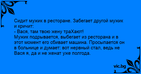 Мужик подрывается, выбегает из ресторана и в этот момент его сбивает машина. Просыпается он в больнице и думает: вот нервный стал, ведь не Вася я, да и не женат уже полгода.