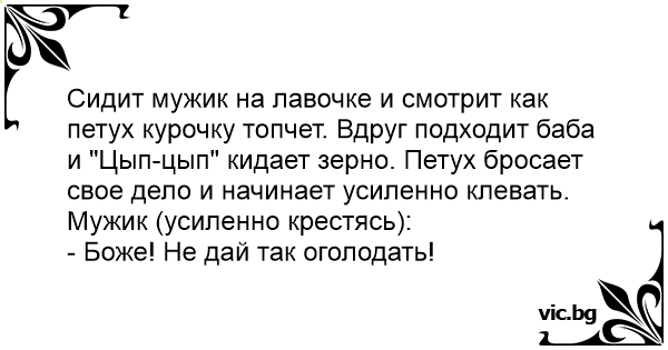Сидит мужик на лавочке и смотрит как петух курочку топчет. Вдруг подходит баба и "Цып-цып" кидает зерно. Петух бросает свое дело и начинает усиленно клевать. Мужик (усиленно крестясь):