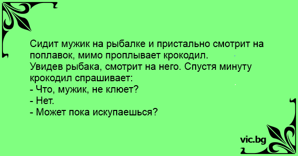 Увидев рыбака, смотрит на него. Спустя минуту крокодил спрашивает: