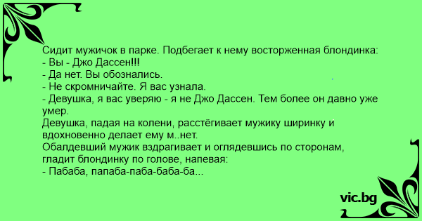 Сидит мужичок в парке. Подбегает к нему восторженная блондинка: