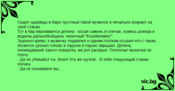 В кръчмата - отчаян дребен мъж...пред него - бира. Влиза як здравеняк, потупва го по рамото, изхилва се гаднярски и му изпива бирата!