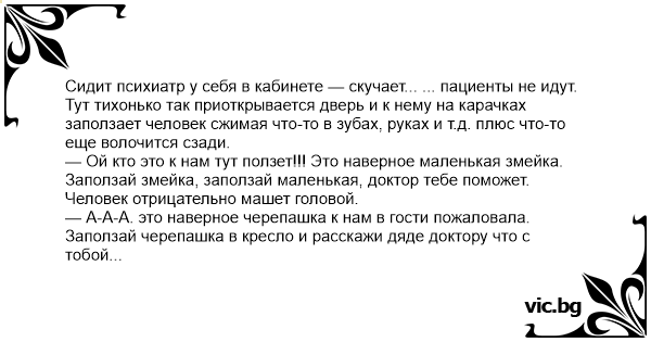 Сидит психиатр у себя в кабинете — скучает... ... пациенты не идут. Тут тихонько так приоткрывается дверь и к нему на карачках заползает человек сжимая что-то в зубах, руках и т.д. плюс что-то еще волочится сзади.