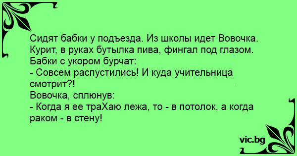 Сидят бабки у подъезда. Из школы идет Вовочка. Курит, в руках бутылка пива, фингал под глазом. Бабки с укором бурчат: