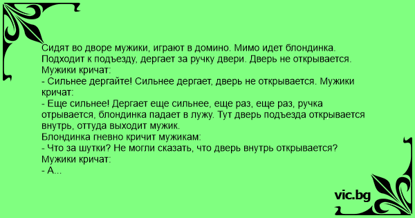Сидят во дворе мужики, играют в домино. Мимо идет блондинка. Подходит к подъезду, дергает за ручку двери. Дверь не открывается. Мужики кричат: