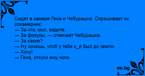 Сидят в камере Гена и Чебурашка. Спрашивает их сокамерник: