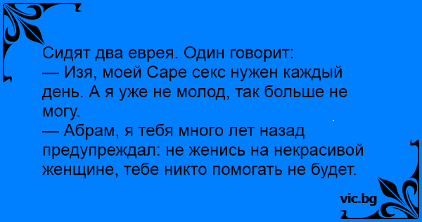 — Изя, моей Саре ceкc нужен каждый день. А я уже не молод, так больше не могу.