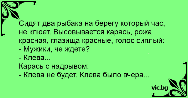 Сидят два рыбака на берегу который час, не клюет. Высовывается карась, рожа красная, глазища красные, голос сиплый: